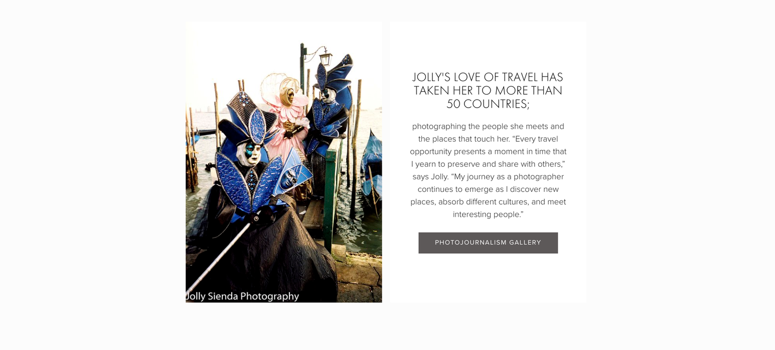 Jolly's variety of photography specialties meant that we needed a cohesive design to serve several different purposes: wedding consultation and portrait session booking, print sales, and galleries of her work. We also knew that her site was going to have more pictures than words, so we devised a local SEO strategy that was key to expanding her business. Thankfully, Squarespace had everything covered. Their powerful tools and integrations are designed especially to make artists stand out online without bogging them down with technical details.